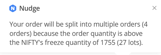 You see a nudge informing you that your order will be split into multiple orders to effectively manage exchange freeze quantity limits when you place large orders. Your large orders are automatically divided into smaller parts to stay within exchange restrictions.
