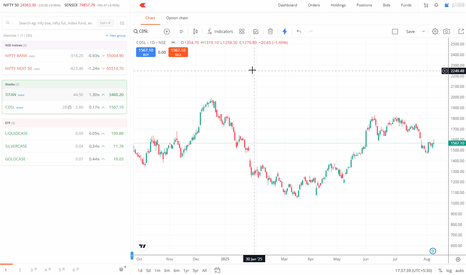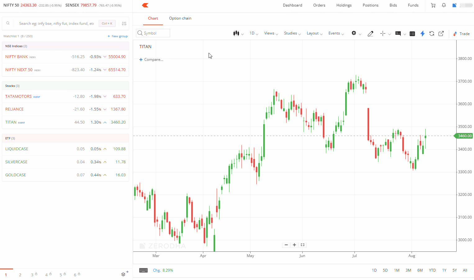 You can compare the relative performance of stocks and indices on Kite using the compare option on charts. This feature shows comparison as a percentage from the starting price to the current price.