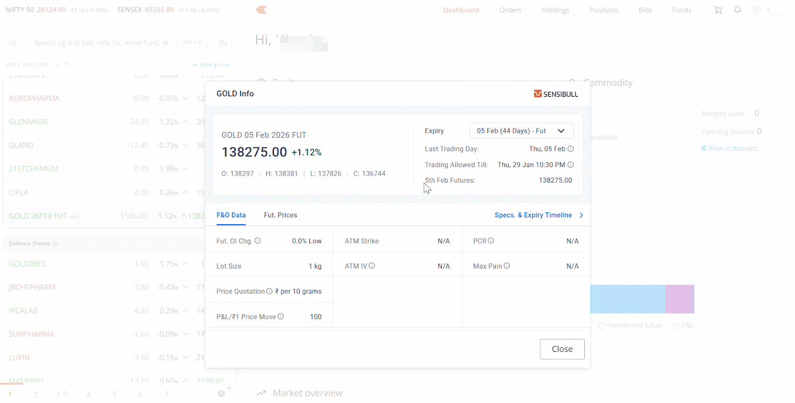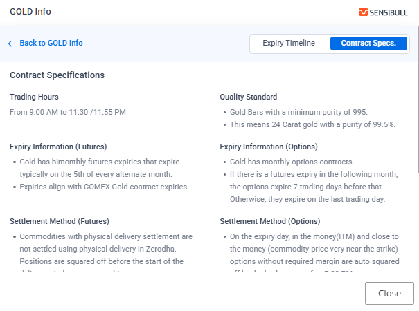 You can view commodity contract details such as lot size, expiry rules, settlement method, and timelines on the Info widget on Kite web.