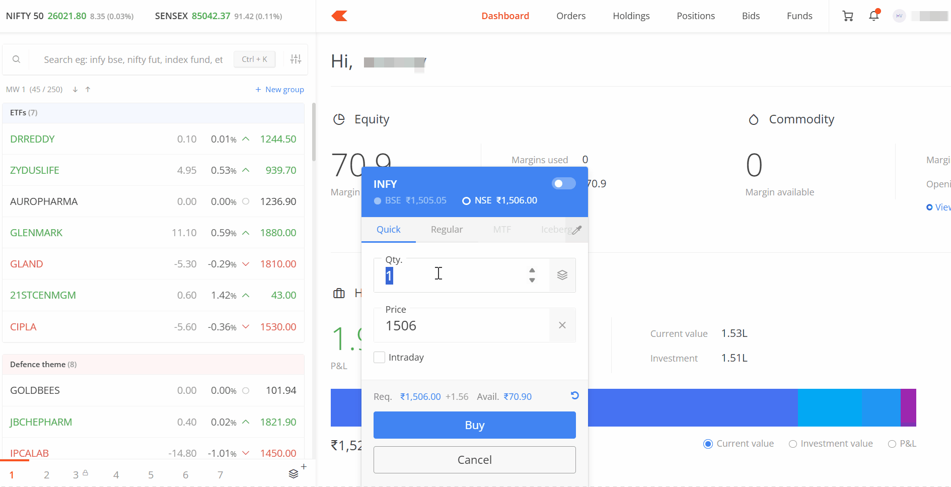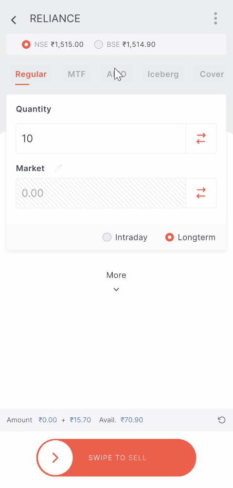 You can buy or sell stocks on either exchange if the stock is listed on both exchanges. To switch between exchanges on the order window, tap or click on BSE or NSE.