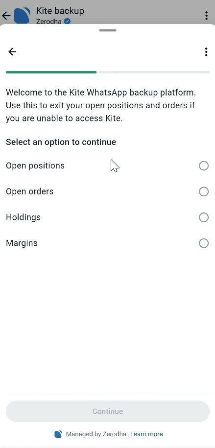 You can exit your open orders and positions through WhatsApp using Kite Backup for free. Kite Backup operates completely independently of Kite's web and mobile software systems, hardware infrastructure, and primary hosting providers (Amazon AWS Cloud and Cloudflare).