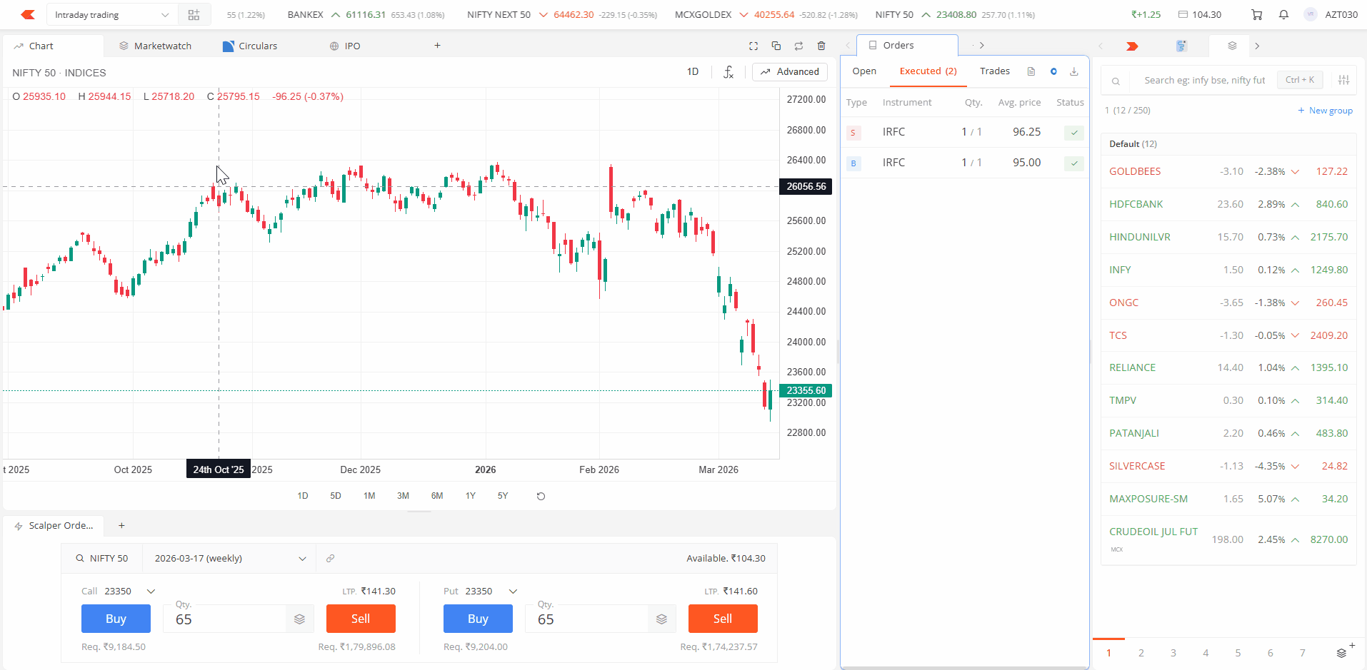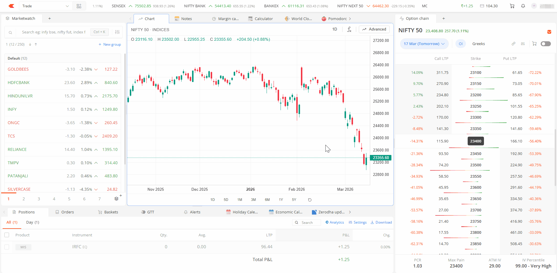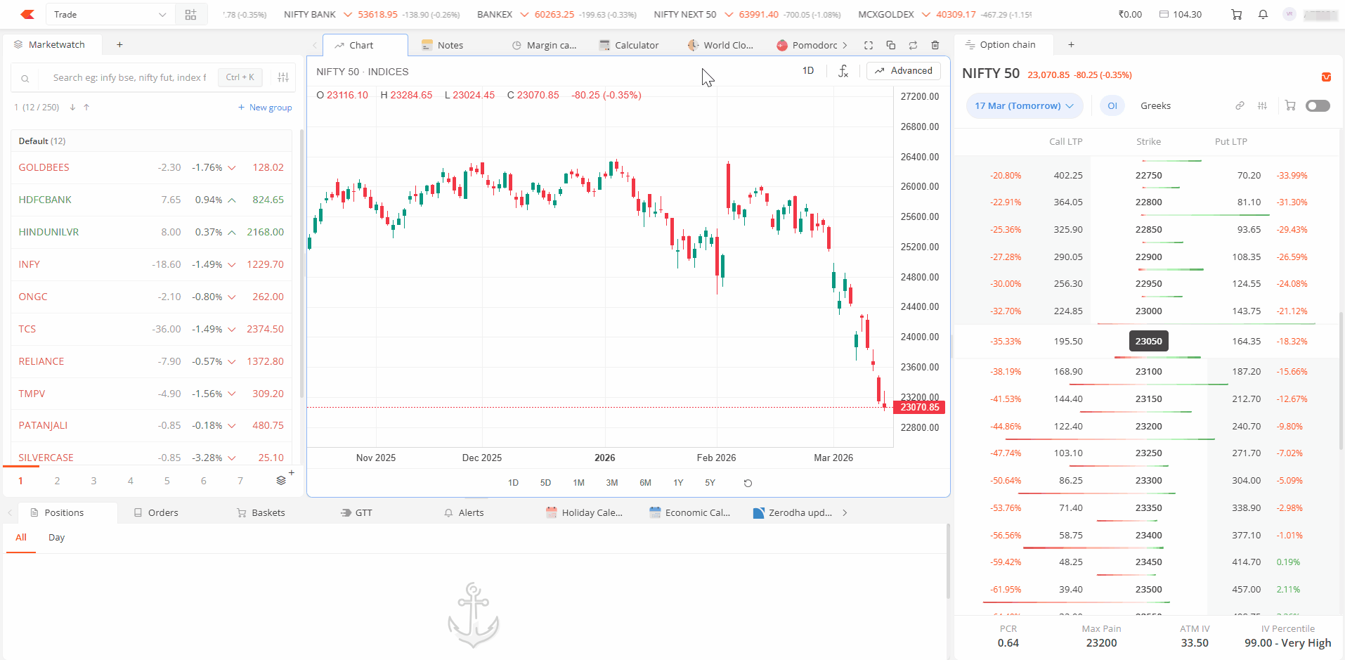 | Option chain | View options data for any index or stock. Hover over a strike price and click B or S to place an order. Switch to basket mode to add multiple strikes for strategies like spreads, straddles, or strangles. |