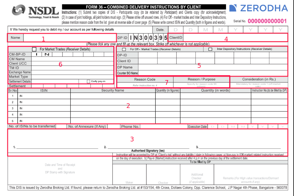 Signature box: Sign exactly as your signature appears in your Zerodha demat account records. If you make any corrections or overwrite your signature, add a counter signature.